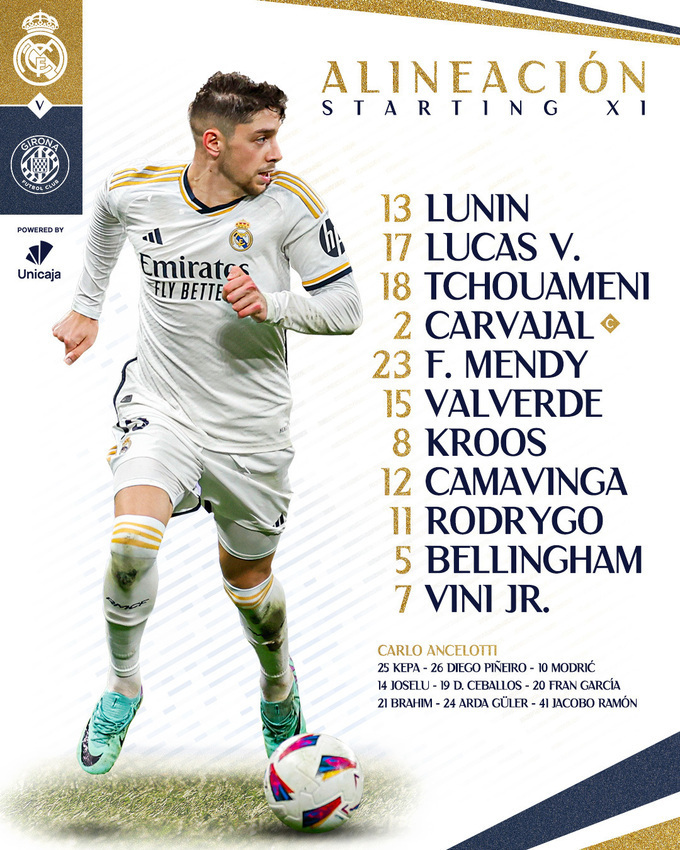«Реал»: Лунін, Лукас, Чуамені, Карвахаль, Менді (Фран Гарсія, 78), Вальверде, Кроос (Модріч, 70), Камавінга, Родріго (Хоселу, 70), Беллінгем (Браім, 57), Вінісіус (Арда Гюлер, 78).