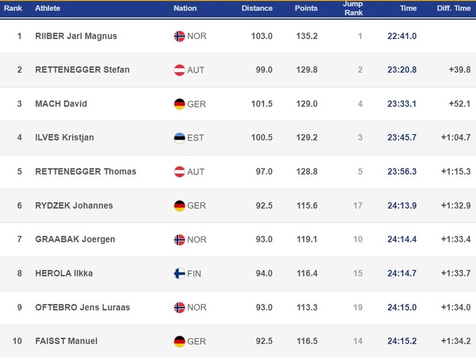 Норвезький двоєборець Ярл Магнус Ріібер оформив переможний хет-трик на етапі Кубка світу в естонському Отепя. Сьогодні він випередив австрійця Штефана Реттенеггера і німця Давіда Маха, для якого це перший у кар'єрі подіум на Кубку світу.