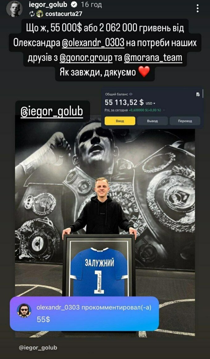 Тренер українського боксера Дениса Берінчика Єгор Голуб у своєму Instagram провів аукціон на футболку київського «Динамо» з прізвищем та підписом уже колишнього головнокомандувача Збройних Сил України Валерія Залужного.