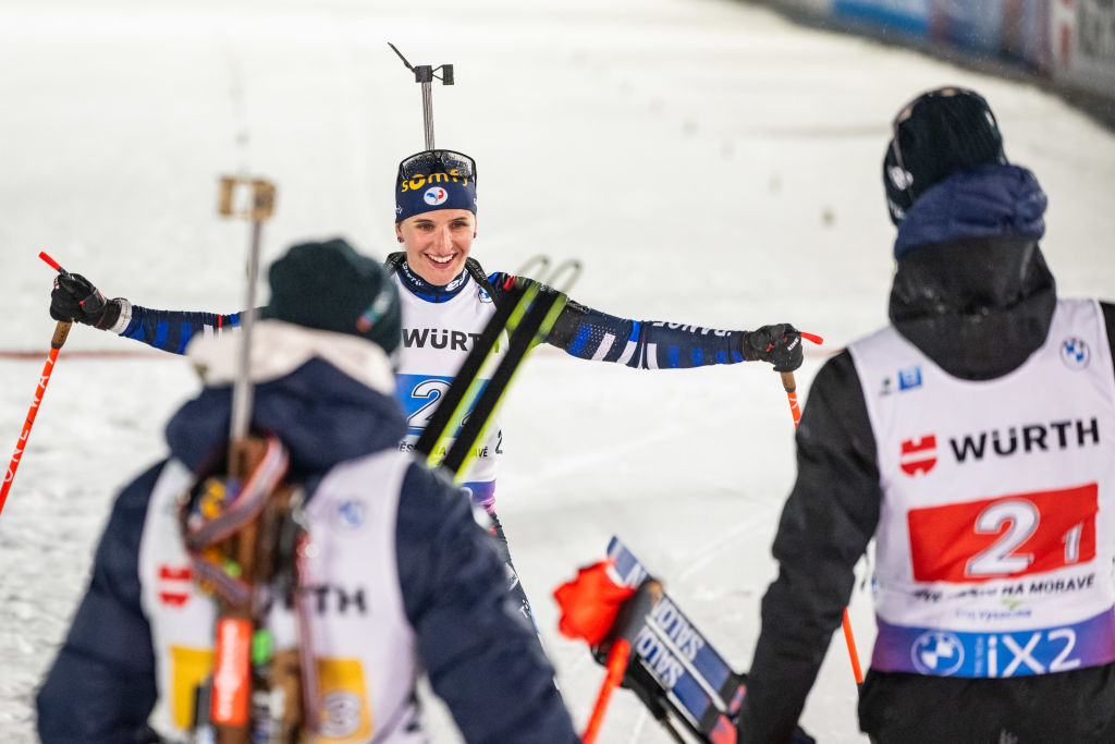Вдалий виступ чоловіків зробив збірну Франції на екваторі головним фаворитом гонки. Адже жіночий склад команди виглядав супертопово. Жюстін Бреза-Буше зі старту розвинула свою знамениту швидкість, наздогнавши Франциску Пройсс. І, як це нерідко стається, одразу була покарана. Коло штрафу на лежці відкинуло француженку на відстань сорока секунд від Пройсс, причому одразу на п’яту позицію. Вище знаходилися також Каролін Кноттен та Лена Хеккі-Гросс, а також Ганна Еберг. Саме завдяки останній Швеція лише на третьому етапі гонки всерйоз увійшла у боротьбу за медалі. Занадто вже посереднім виявився стартовий відрізок у виконанні Себастьяна Самуельссона.