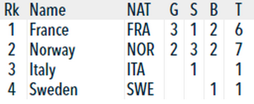 У медальному заліку змагаються, за великим рахунком, лише збірні Франції та Норвегії. Поки французи попереду, маючи три золота проти двох у конкурентів. Але у норвежців більше на одну нагороду в сумі.