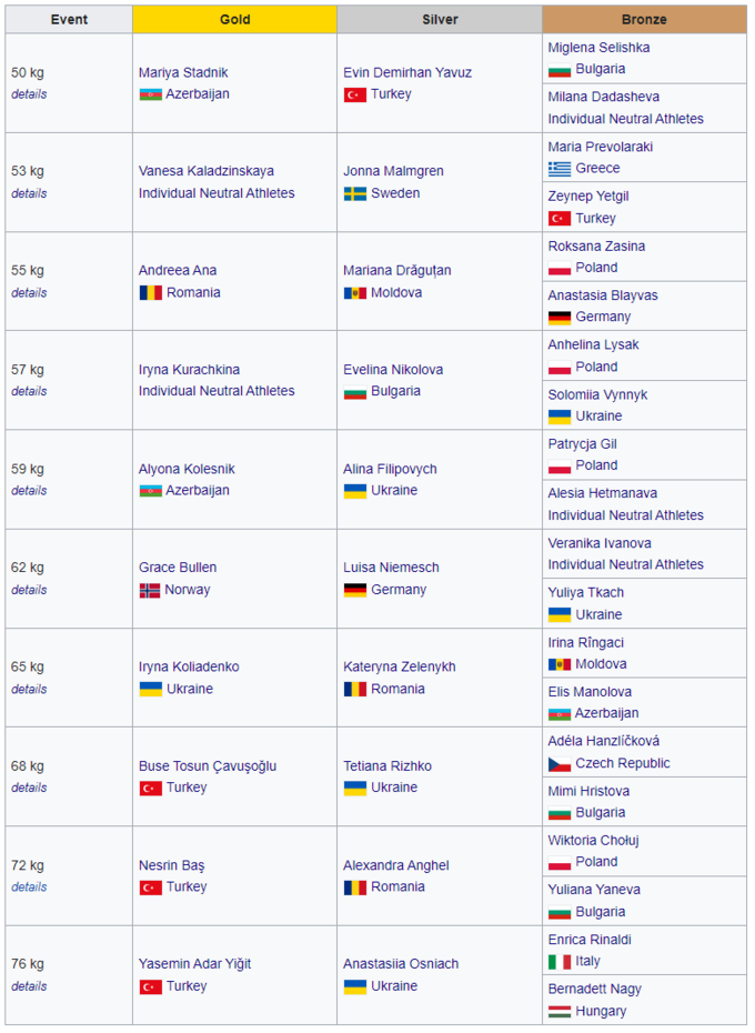 Бронзові медалі здобули Соломія Винник (до 57 кг) та Юлія Ткач-Остапчук (до 62 кг).