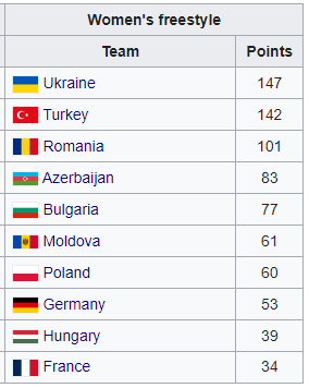 У командному заліку за очками виграла жіноча збірна України (147 очок), випередивши Туреччину (142) та Румунію (101).