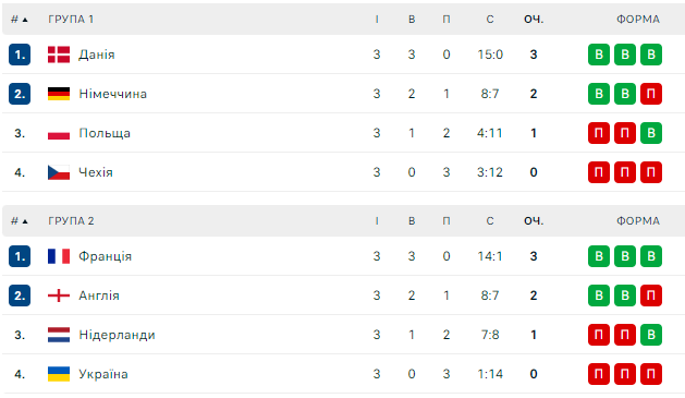 В останньому 3-му турі групового раунду збірна України поступилася команді Франції із сухим рахунком 0:5, а Англія обіграла Нідерланди.