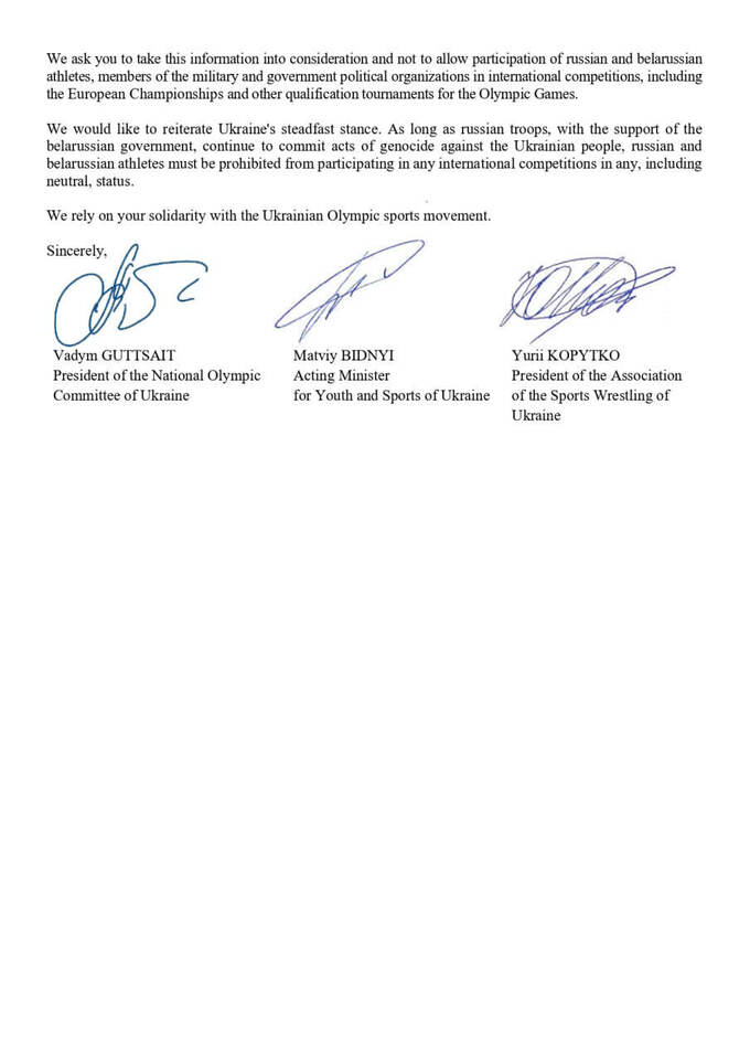 Хочемо ще раз підкреслити непохитну позицію України. Поки російські війська за підтримки уряду білорусі продовжуватимуть здійснювати акти геноциду проти українського народу, російським і білоруським спортсменам має бути заборонено брати участь у будь-яких міжнародних змаганнях, у будь-якому статусі, зокрема в нейтральному».