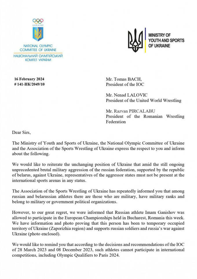 Президент Національного олімпійського комітету України Вадим Гутцайт разом з в.о. Міністра молоді та спорту України Матвієм Бідним, а також президентом Асоціації спортивної боротьби України Юрієм Копитком звернулися до президента МОК Томаса Баха, президента United World Wrestling (Об’єднання світової боротьби) Ненада Лаловіча, президента Федерації боротьби Румунії Развана Пірцалабу.