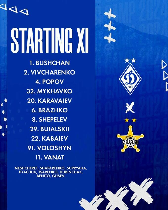 «Динамо» Київ: Бущан – Вівчаренко, Михавко (Дячук, 64), Попов, Караваєв – Шепелєв (Шапаренко, 46), Бражко – Кабаєв (Беніто, 70), Буяльський, Волошин – Ванат.
