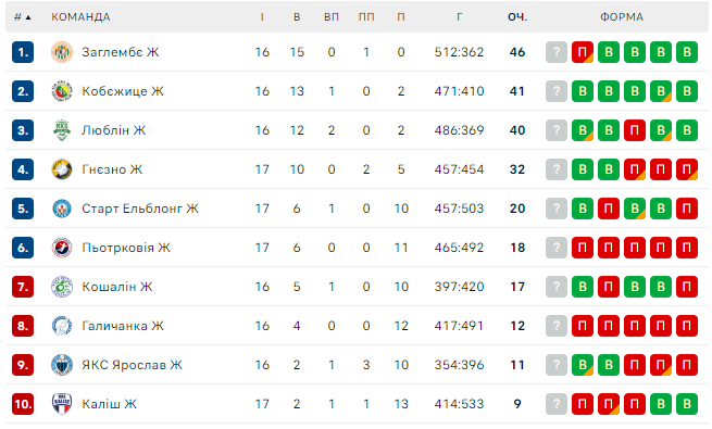 Галичанка посідає 8-ме місце серед 10 команд, маючи 12 очок (4 перемоги та 12 поразок).