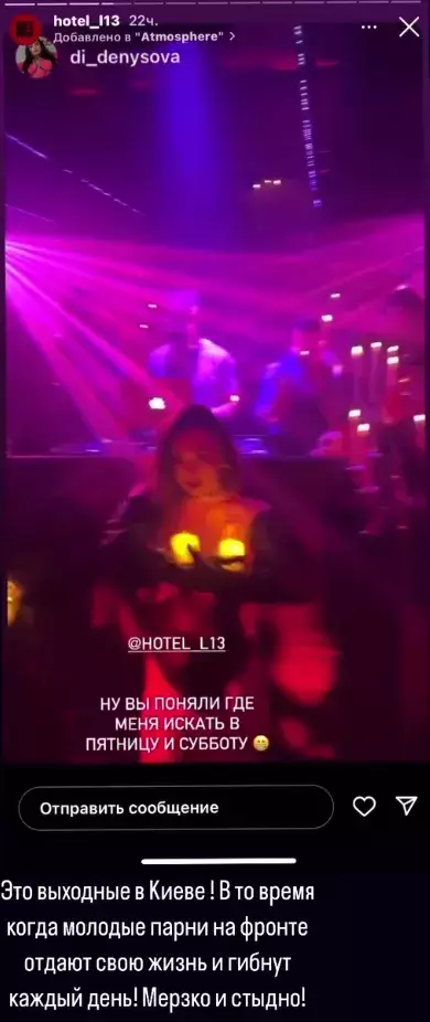 «Це вихідні у Києві! У цей час, коли молоді хлопці на фронті віддають своє життя і гинуть кожен день. Гидко та соромно!», – написала Суркіс в коментарі до сторіз, де показаний один із нічних клубів Києва.