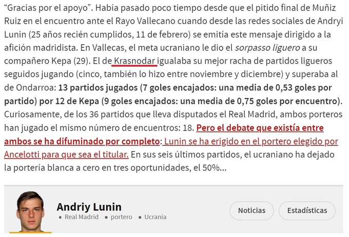Журналіст авторитетного іспанського видання As Августін Мартін припустився грубої помилки у своєму матеріалі про голкіпера «Реала» Кепу Аррісабалагу. Він назвав українця Андрія Луніна уродженцем російського міста краснодар.