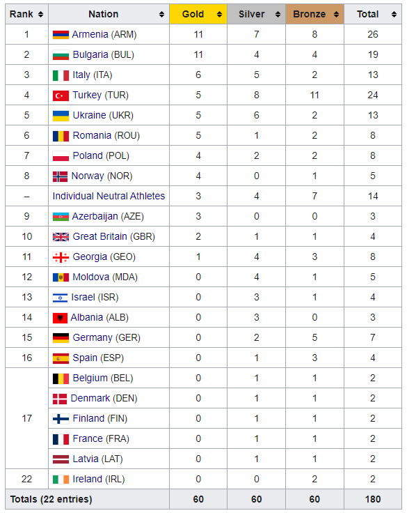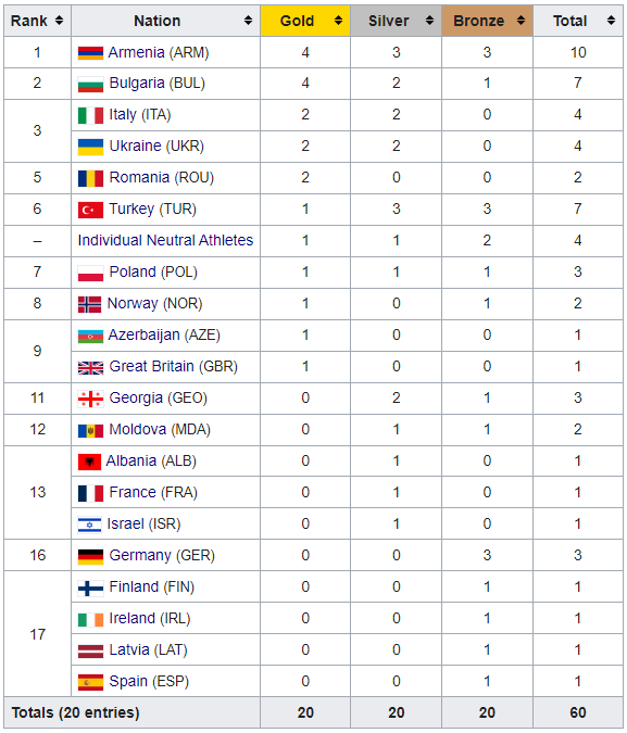 У топ-3 увійшли: Вірменія (4–3–3), Болгарія (4–2–1), Італія та Україна (по 2–2–0).