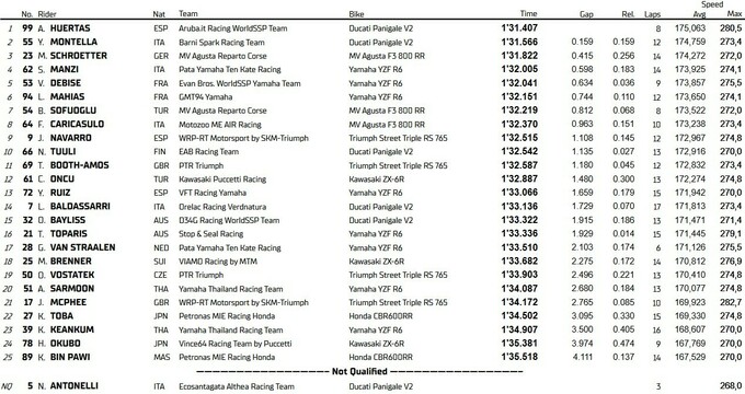 Для молодого іспанця цей поул – перший у кар'єрі у WorldSSP. Крім того, результат Уертаса, 1.31.407 - новий рекорд кола. З першого стартового ряду також стартуватимуть ще один райдер на Дукаті Ярі Монтелла з Barni та лідер заводської команди MV Agusta Марсель Шрьоттер.