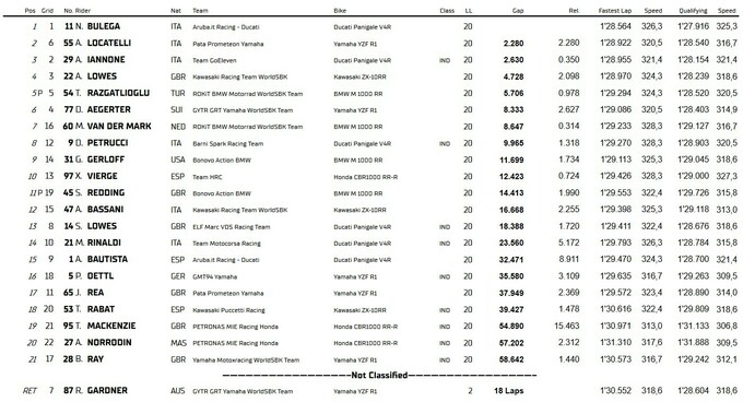 Італієць вийшов у лідери на сьомому колі після помилки Андреа Янноне з GoEleven, який лідирував зі старту. Після хвилі змін коліс Булега зберіг першу позицію, довів гонку до перемоги та став першим райдером, який виграв поспіль гонки у різних класах – минулий сезон у класі Supersport він завершив перемогою в другій гонці у Хересі.