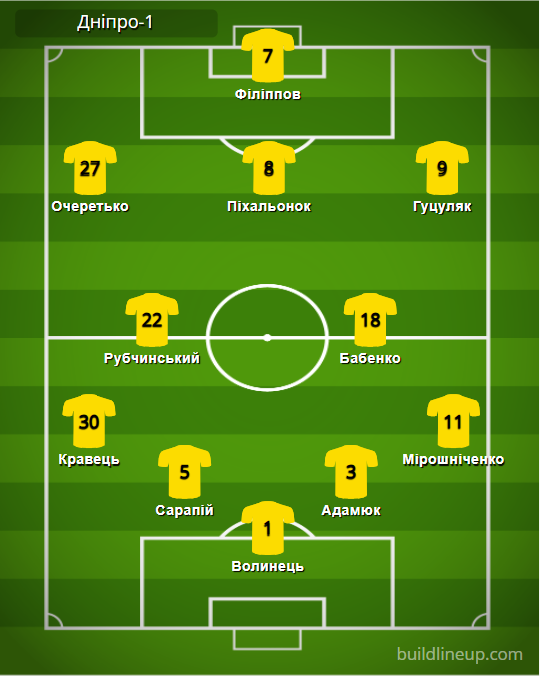 «Дніпро-1»: Волинець – Кравець, Сарапій, Адамюк, Мірошніченко (Є. Пасіч, 76) – Рубчинський, Бабенко – Очеретько (Горбунов, 46), Піхальонок, Гуцуляк – Філіппов (Ківінда, 76).