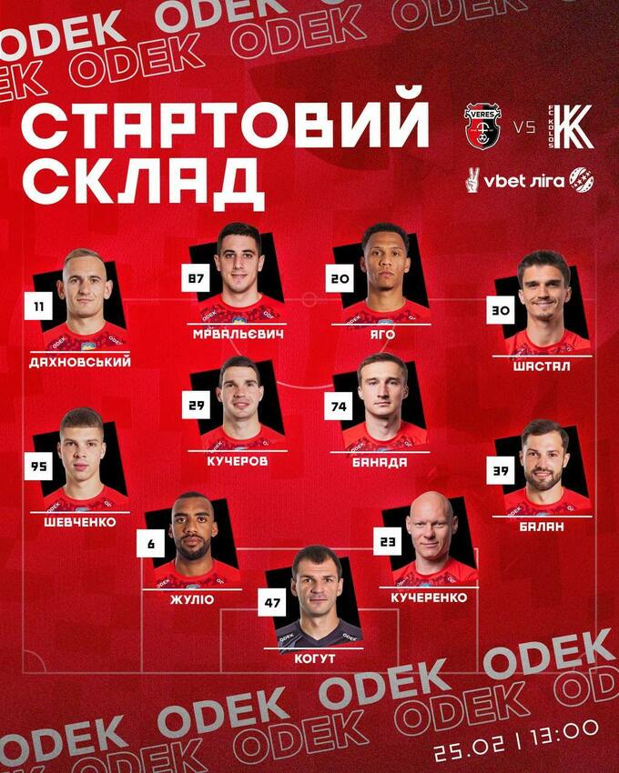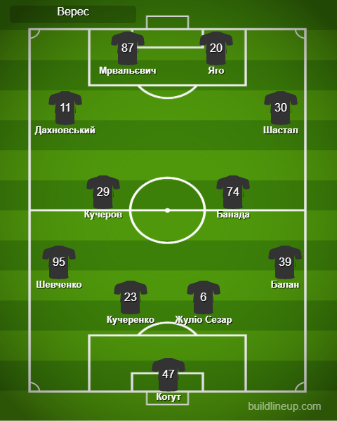 «Верес»: Когут, Балан (Гакман, 60), Кучеренко, Жуліо Сезар, Шевченко, Банада, Кучеров, Шастал (В.Шарай, 60), Яго (Годя, 68), Мрвальєвич (Гайдучик, 68), Дахновський (Янаков, 83).
