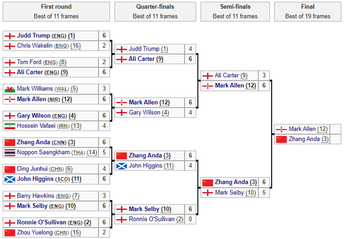 У неділю Чжан Анда грає з Марком Алленом у матчі за титул з 19 фреймів, з головним призом у £125 тисяч на кону та можливістю додати до свого рекорду другий рейтинговий титул.