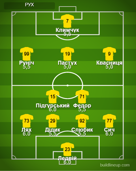 «Рух»: Ледвій - Сич, Слюбик, Дідик, Лях - Підгурський (Притула, 53), Федор (Таллес, 53) - Квасниця (Теслюк, 85), Пастух, Руніч (Плюман, 53) - Климчук (Карабін, 76)
