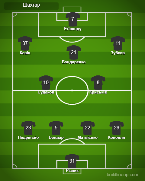 «Шахтар»: Різник, Бондар, Егіналду (Сікан, 46), Криськів (Степаненко, 56), Судаков, Зубков (Швед, 35), Бондаренко, Матвієнко, Педріньйо, Конопля, Кевін (Траоре, 56).