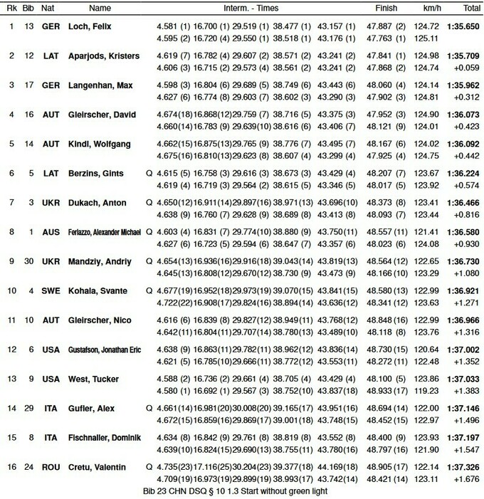 Перемогу на етапі здобув німець Фелікс Лох, котрому Дукач програв 0.816 секунди. Другим став місцевий спортсмен Крістерс Апарйодс, а замкнув першу трійку ще один саночник із Німеччини Макс Лангенхан.