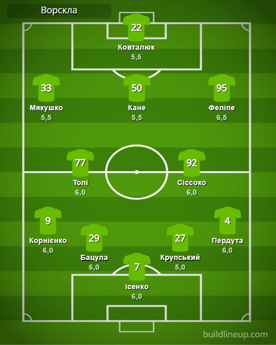 «Ворскла»: Ісенко – Корнієнко, Бацула, Крупський, Пердута – Толі (Челядін, 61), Сіссоко (Галас, 83) – Мякушко (Хрипчук, 84), Кане (Нестеренко, 61), Феліпе – Ковталюк.
