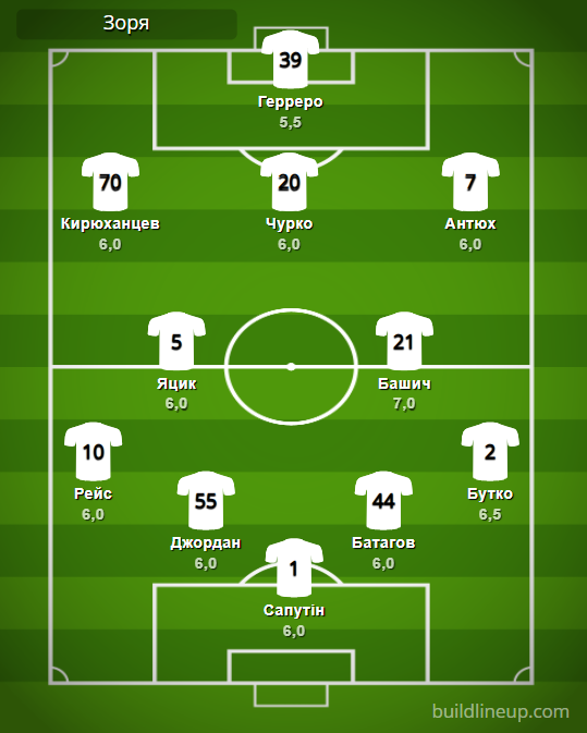 «Зоря»: Сапутін – Рейс (Мишньов, 89), Джордан, Батагов, Бутко – Яцик, Башич – Кирюханцев, Чурко (Мічін, 49, Волошин, 88), Антюх – Герреро (Боль, 88).