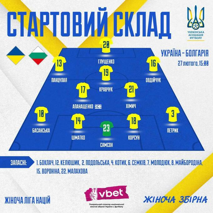 Україна: Самсон (Боклач, 84) – Басанська, Шматко, Корсун, Петрик – Овдійчук (Малахова, 84), Апанащенко (Семків, 71), Хімич, Панцулая – Глущенко (Молодюк, 84), Кравчук (Майбородіна, 71).