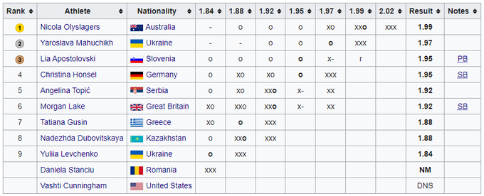 - 1. Нікола Оліслагерс (Австралія) – 1.99 м