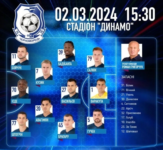 «Чорноморець»: Варакута, Бойчук, Салюк, Гучек, Брагару, Васильєв, Кузик, Авагімян, Штогрін, Бадібанга, Ієде