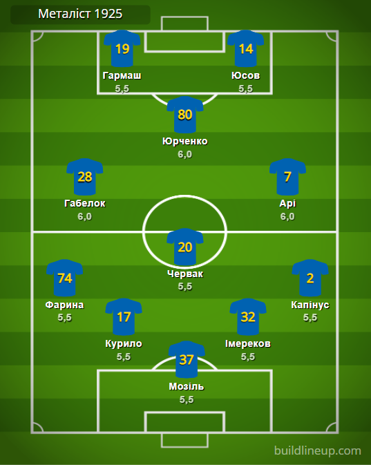 «Металіст 1925»: Мозіль – Капінус (Вачіберадзе, 82), Імереков, Курило, Фарина – Червак (Русин, 46) – Арі, Габелок – Юрченко (Жичиков, 82) – Юсов (Бичек, 67), Гармаш (Фрімпонг, 67).