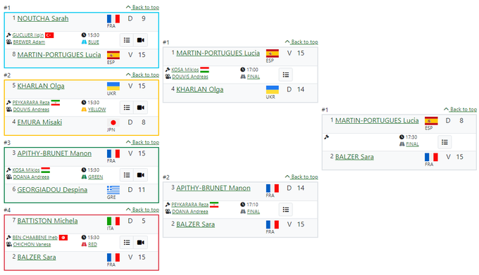 В іншому півфіналі зустрілися Сара Бальцер та Манон Брюне, знамениті шпажистки із Франції. Також усе вирішив останній укол – 15:14 на користь Бальцер.