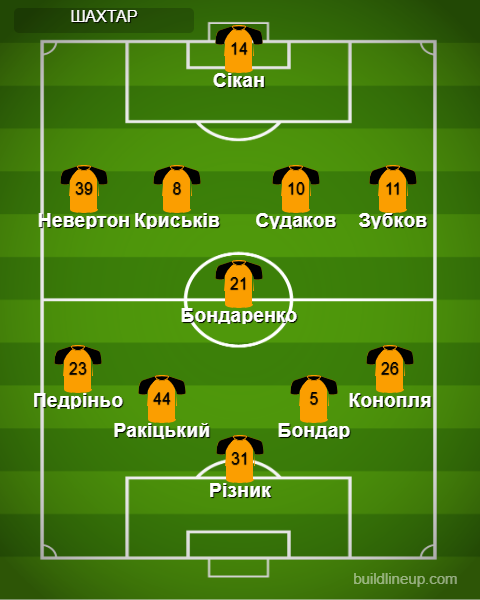 «Шахтар»: Різник - Конопля, Бондар, Ракіцький, Педріньо (Азаров, 90) - Бондаренко, Криськів (Цуканов, 90) - Зубков (Швед, 90), Судаков, Невертон (Назарина, 61) - Сікан (Траоре, 75).