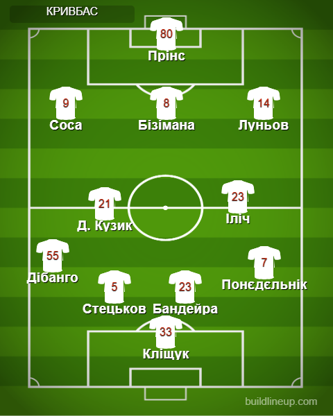 «Кривбас»: Кліщук - Бандейра, Понєдєльнік, Стецьков, Дібанго - Кузик (Задерака, 75), Ілич - Луньов (Вакулко, 63), Бізімана, Соса (Блізніченко, 63) - Прінс Аду 9Кожушко, 63).