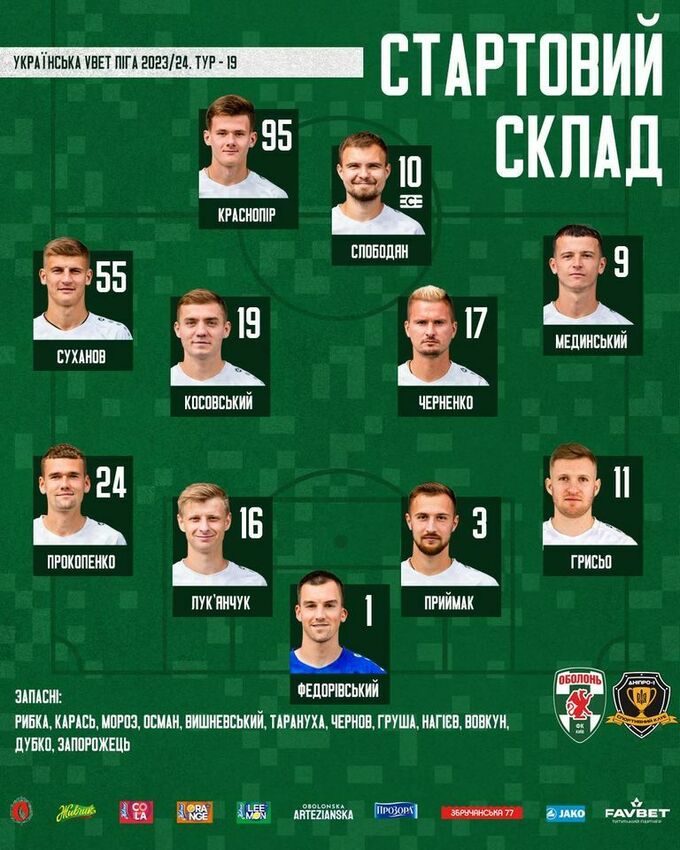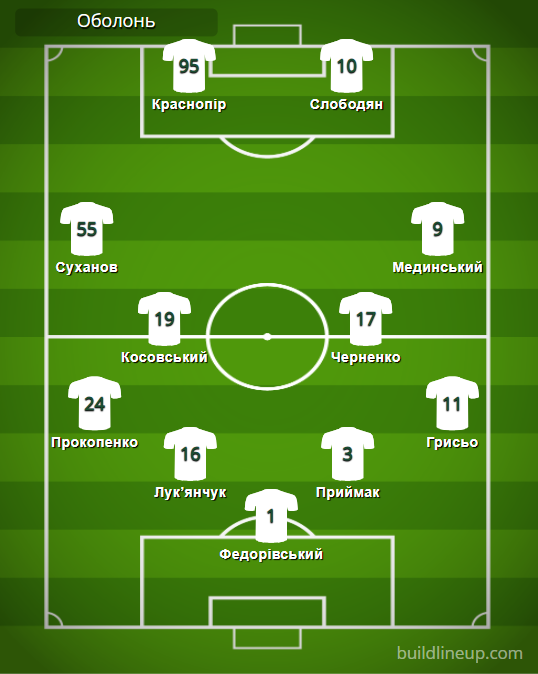 «Оболонь»: Федорівський – Прокопенко, Лук’янчук, Приймак, Грисьо (Тарануха, 81) – Суханов (Дубко, 67), Косовський (Мороз, 74), Черненко, Мединський – Краснопір (Вишневський, 81), Слободян.