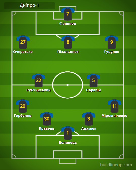 «Дніпро-1»: Волинець – Горбунов, Кравець, Адамюк, Мірошніченко – Рубчинський, Сарапій – Очеретько (Гаджиєв, 73), Піхальонок, Гуцуляк – Філіппов (Ківінда, 56, Є. Пасіч, 90).
