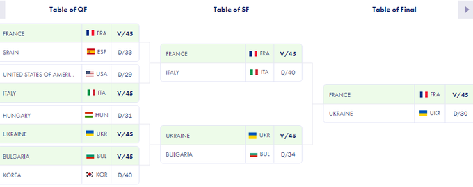 У фіналі зустрілися команди України та Франції. Ольга Харлан із подругами відпустили суперниць уперед на 10+ очок і ліквідувати гандикап не зуміли (30:45).