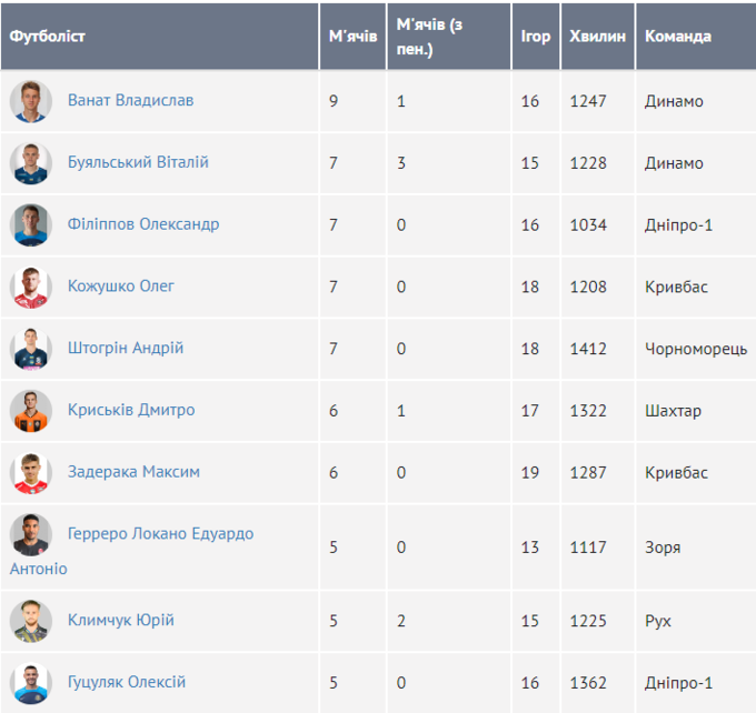 Нападник «Динамо» Владислав Ванат очолює рейтинг, маючи 9 голів та 6 асистів (15 результативних дій).