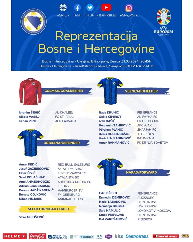 - Нападники: Едін Джеко («Фенербахче», Туреччина), Ермедін Демирович («Аугсбург», Німеччина), Харіс Табакович («Герта», Німеччина), Неманья Бильбия («Зринськи»), Саїд Хамулич («локомотив», росія), Смайл Превляк («Герта», Німеччина), Дал Варешанович («Різеспор», Туреччина).