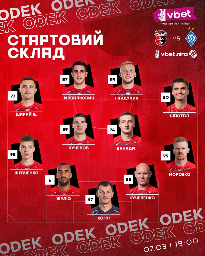 Запасні: Нещерет, Моргун, Вівчаренко, Тимчик, Діалло, Сирота, Біловар, Пономаренко.