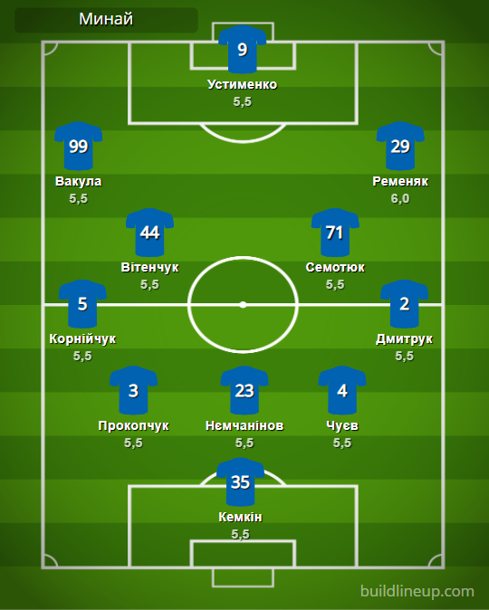 «Минай» (заміни): Кораблін – 6,0, Гунічев – 5,5, Матюшенко – 6,0, Кисіль – б/о, Демиденко – б/о.