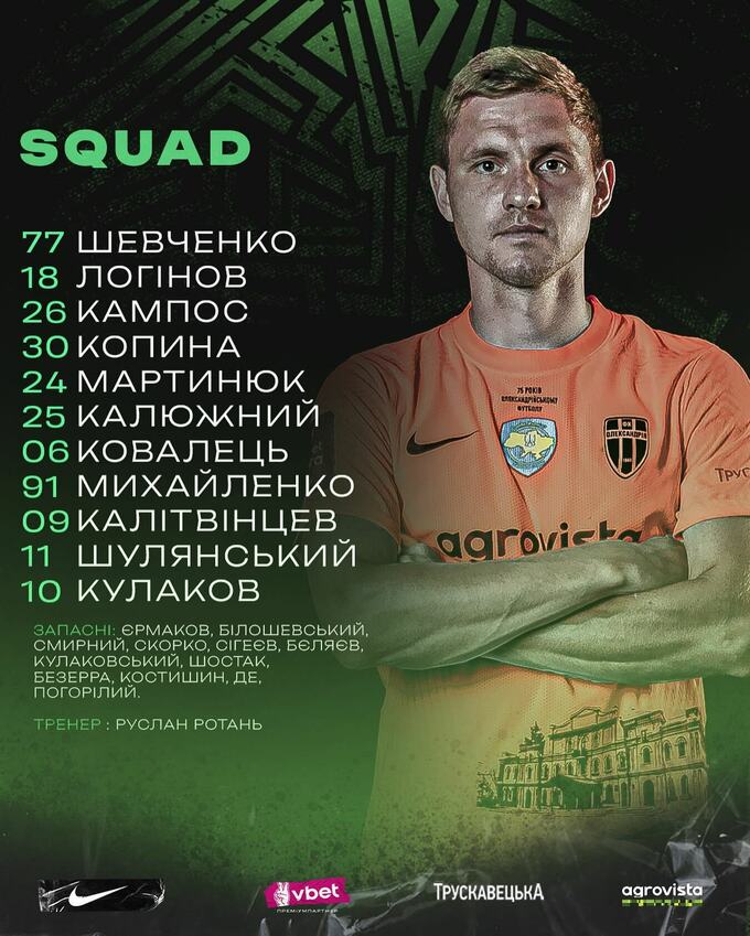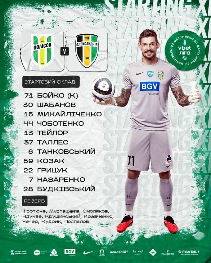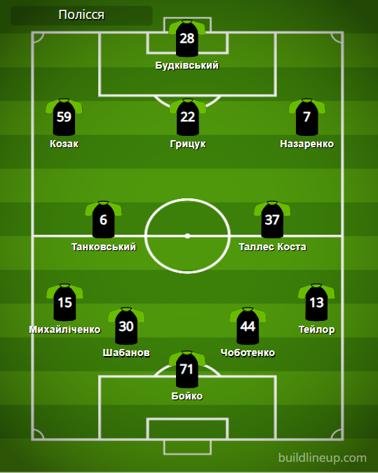 «Полісся»: Бойко – Михайліченко, Шабанов, Чоботенко, Тейлор – Танковський (Кравченко, 84), Таллес Коста (Крушинський, 46) – Козак, Грицук (Мустафаєв, 46), Назаренко (Фортюне, 59) – Будківський.