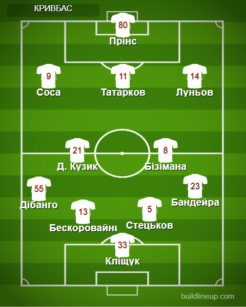 «Кривбас»: Кліщук – Бандейра, Бескоровайний, Стецьков, Дібанго – Д. Кузик (Хомченовський, 86), Бізімана – Луньов (Твердохліб, 65), Татарков (Вакулко, 46), Соса (Понєдєльнік, 86)– Прінс (Кожушко, 72)