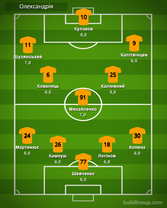 «Олександрія»: Шевченко – Мартинюк, Кампуш, Логінов, Копина (Скорко, 85) – Ковалець, Михайленко (Шостак, 81), Калюжний – Шулянський (Костишин, 81), Кулаков (Погорілий, 71), Калітвінцев (Бєляєв, 71).