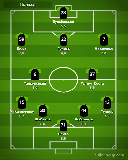 «Полісся»: Бойко – Михайліченко, Шабанов, Чоботенко, Тейлор – Танковський (Кравченко, 84), Таллес Коста (Крушинський, 46) – Козак, Грицук (Мустафаєв, 46), Назаренко (Фортюне, 59) – Будківський.