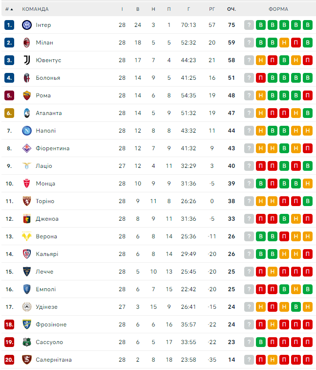 Рома входить у топ-5 (48 очок). Фіорентина йде 8-ю (43 очки).