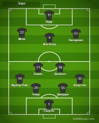«Зоря»: Сапутін – Капустян, Джордан, Токар, Рейс, Башич, Жан Клод, Писаренко, Мічін, Долбнєв (Байрук, 90+1), Ндур (Гільєрме, 79).