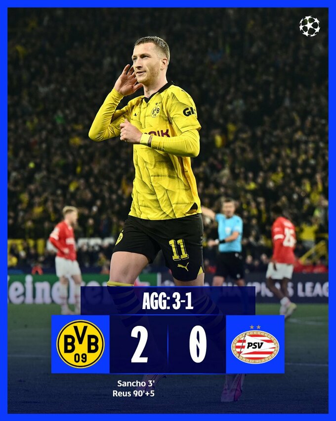 Боруссія Дортмунд завдала поразки ПСВ (2:0) після нічиєї у першому матчі (1:1). У господарів поля відзначилися Джейдон Санчо та Марко Ройс.