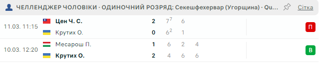 - Патрік Месарош (Угорщина) [WC] – Олексій Крутих (Україна) [11] – 6:4, 2:6, 4:6