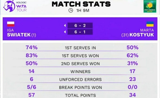 SUPREME 𝟏GA 🥶@iga_swiatek sees off Kostyuk and advances to the @BNPPARIBASOPEN showpiece final for the second time in her career! #TennisParadise pic.twitter.com/hOJbHRpLLr