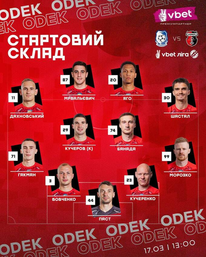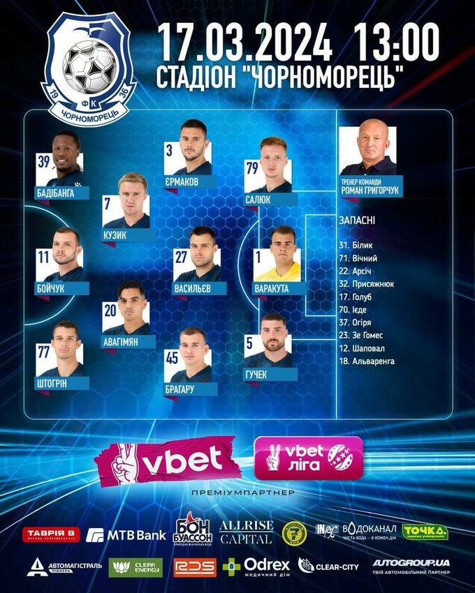 «Чорноморець»: Варакута – Брагару, Гучек, Салюк, Єрмаков – Авагімян (Зе Гомеш, 85), Васильєв, Кузик (Ієде, 76) – Штогрін, Бадібанга, Бойчук.
