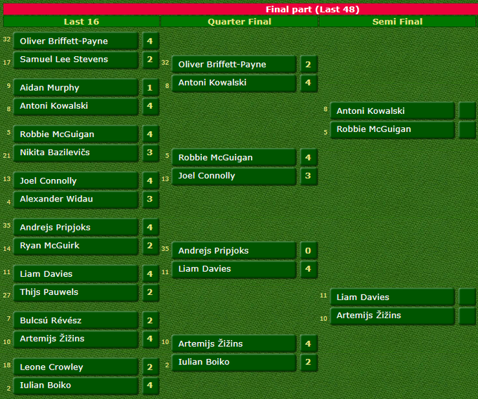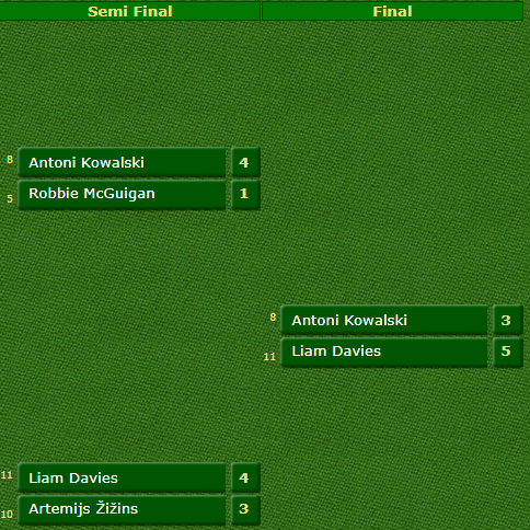 - Антоні Ковальськи (Польща) – Ліам Девіс (Уельс) – 3:5